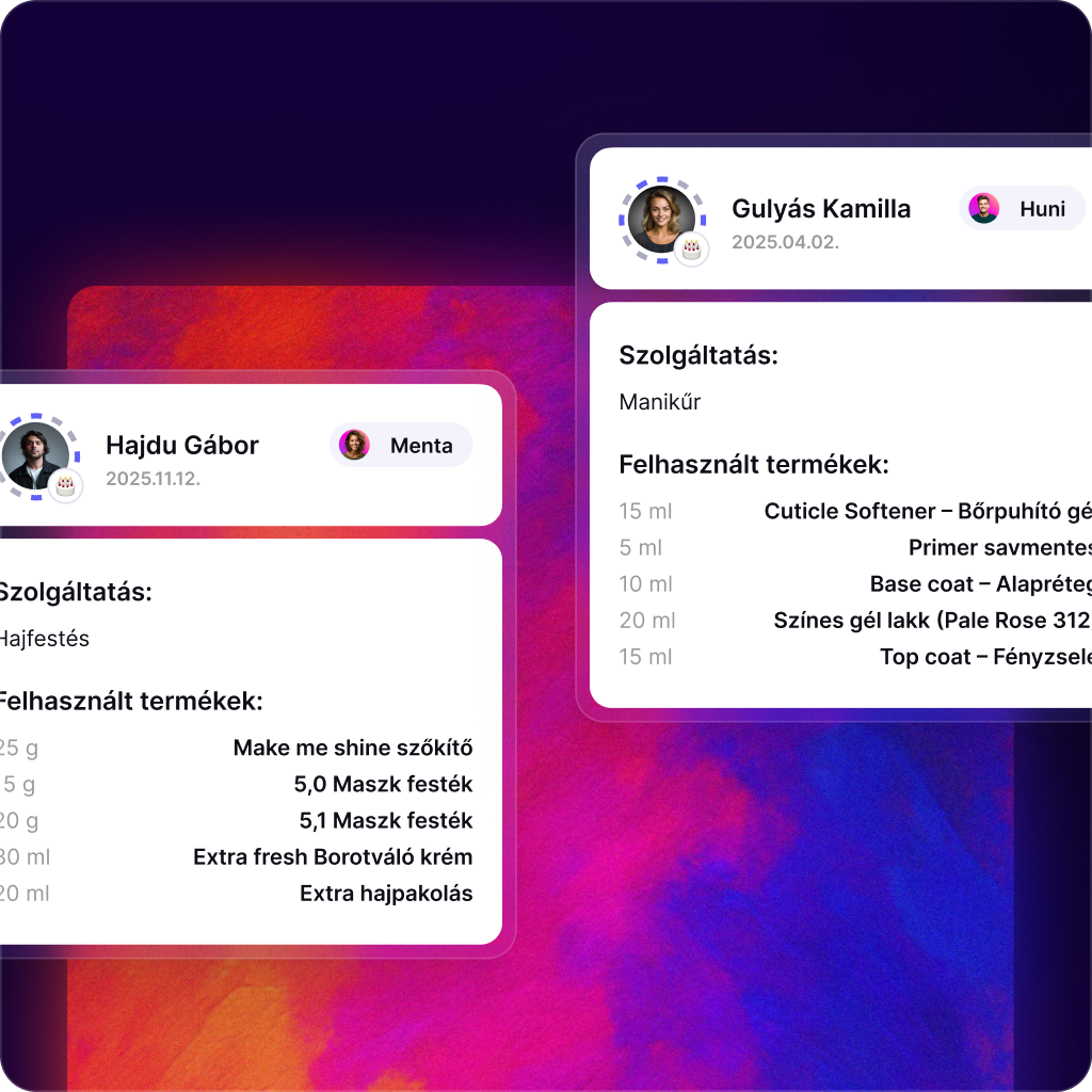 A rendszer automatikusan összegyűjti a foglalások, jegyzetek, vásárlások adatait. Látod a teljes történetet.
